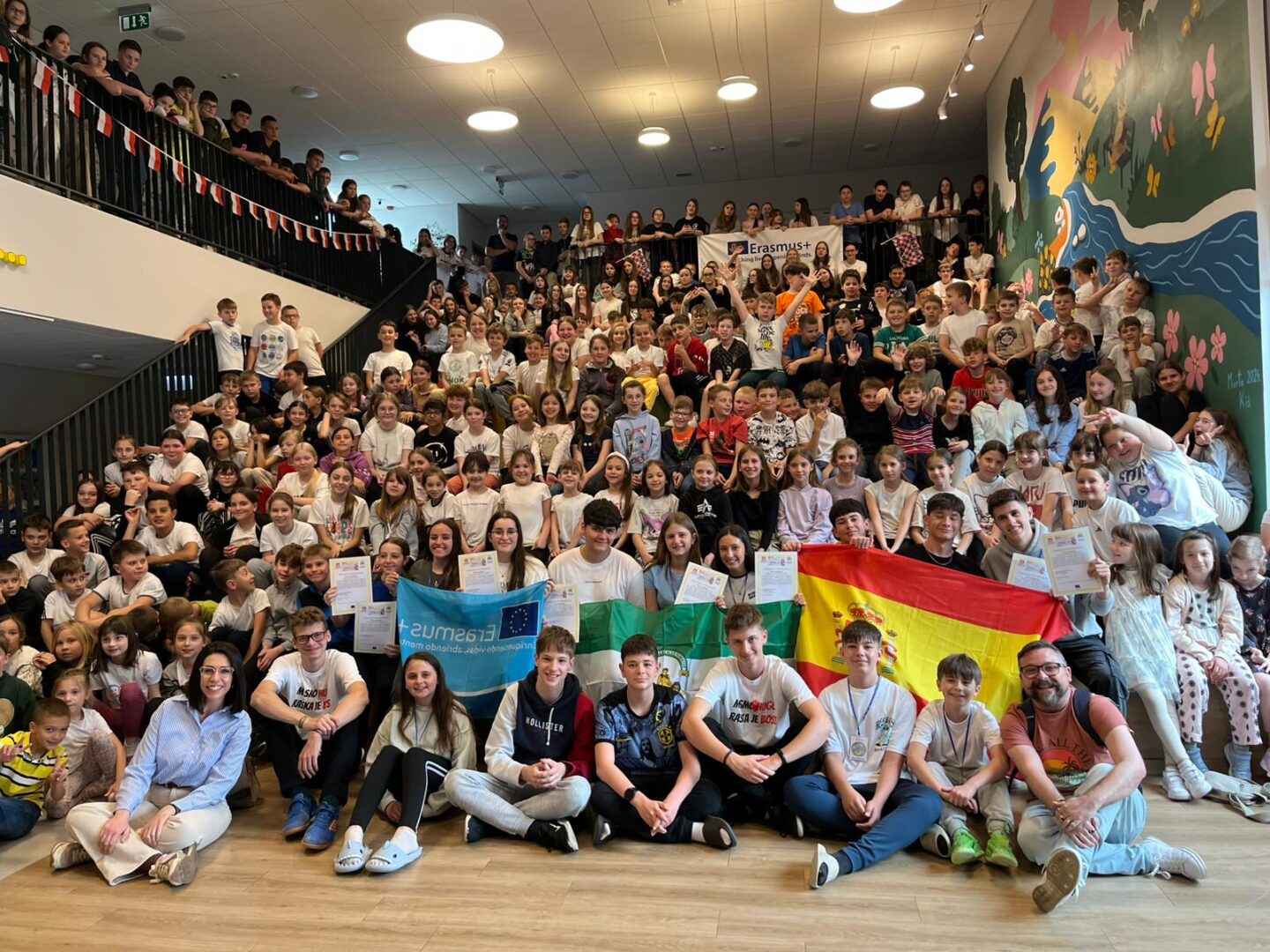 Zatim, učenici i učitelji okupili su se na tribinama kako bi ispratili drage goste iz Linaresa, kojima je ovo bio posljednji dan boravka u sklopu Erasmus mobilnosti na OŠ Podolice. U svečanom, ali emotivnom trenutku, njihovi domaćini uručili su im certifikate za sudjelovanje u razmjeni, uz srdačne zagrljaje, a nastavnici Juan Pablo i Sandra, kao i koordinatorica Ivana Polančec uputili su zahvale uključenim nastavnicima i domaćinima svoje grupe.