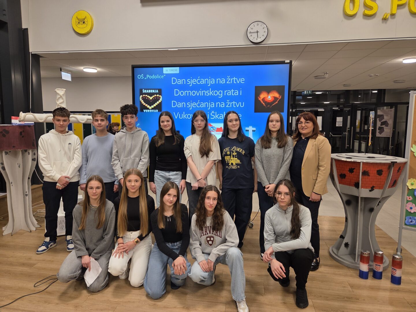 Učenici 1. b razreda pročitali su imena neke od ukupno 402 djece stradale u Vukovaru, imena koja trebamo pamtiti zauvijek. Potom su učenice Marta Žužul i Iva Mikulec pročitale svoje autorske pjesme napisane u čast svih onih kojih se sada prisjećamo.